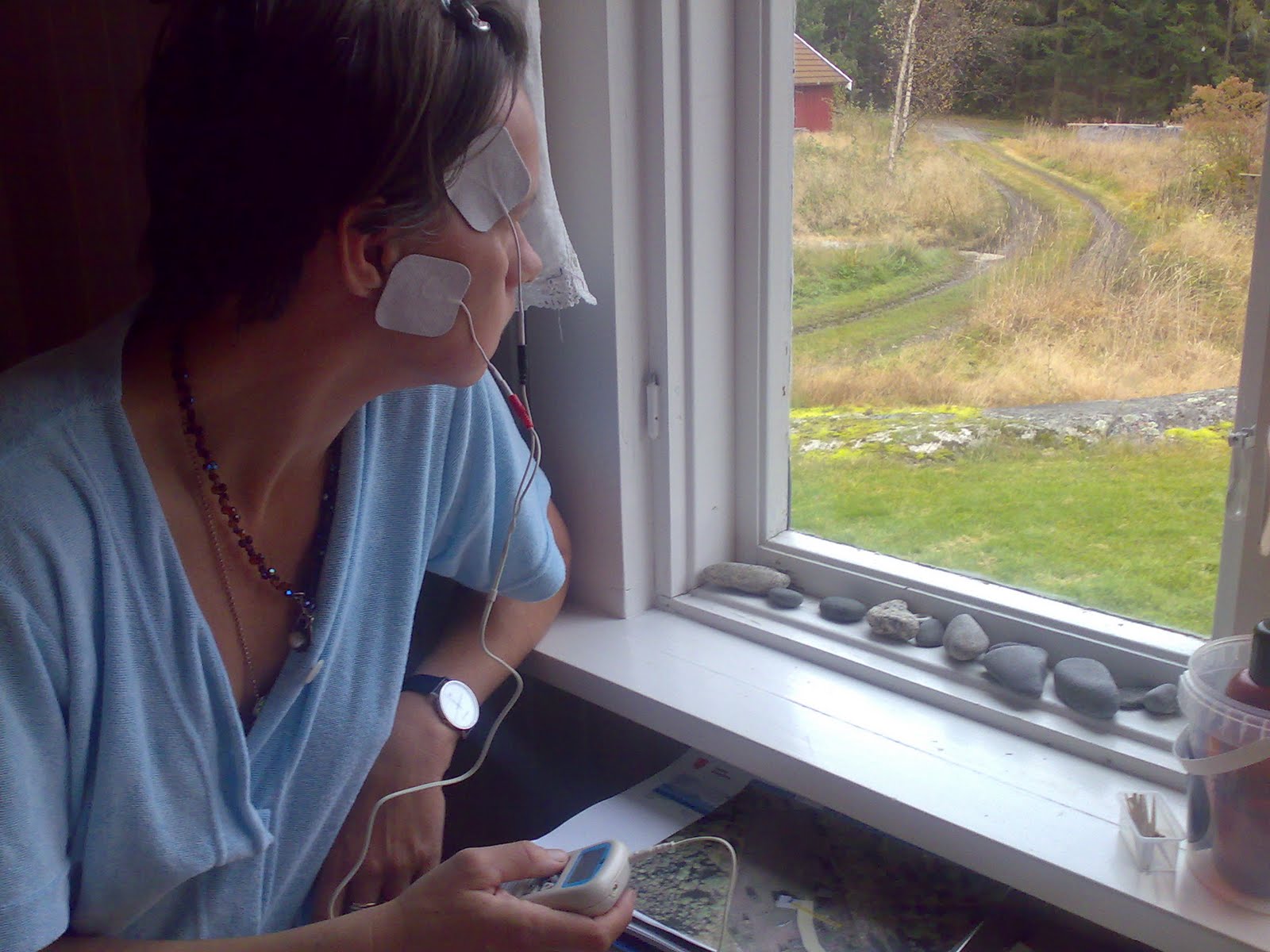 As kiropraktor har skaffet henne en elektrisk ansiktsmassasjegreie med små elektroder som hun fester i ansiktet og hver morgen og kveld sitter hun med disse elektrodene i ansiktet og ser ganske gal ut.